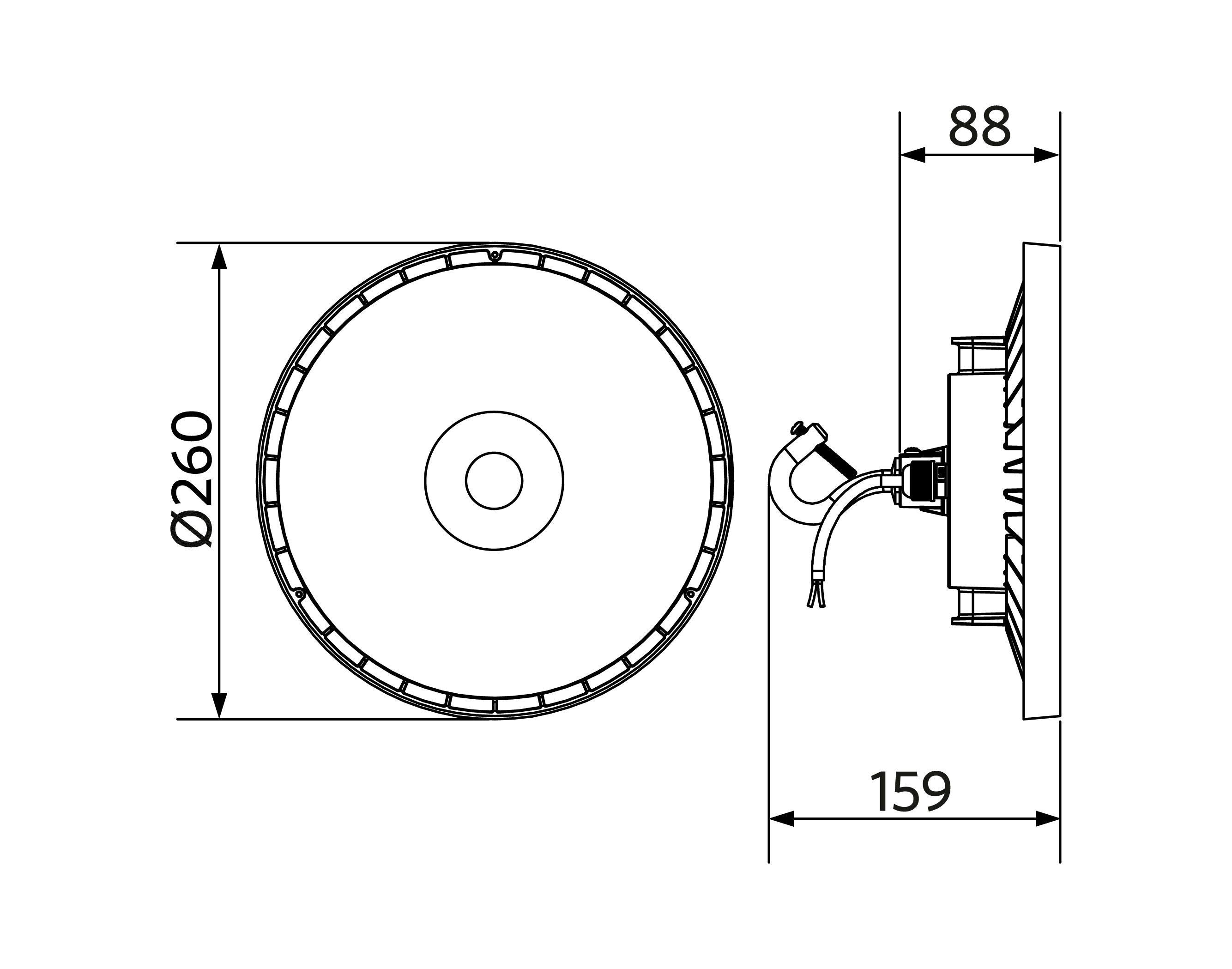 Soluzione ideale per soffitti elevati. Design slim ed elegante. Riflettori, staffa e connettore IP68 disponibili come accessorio.