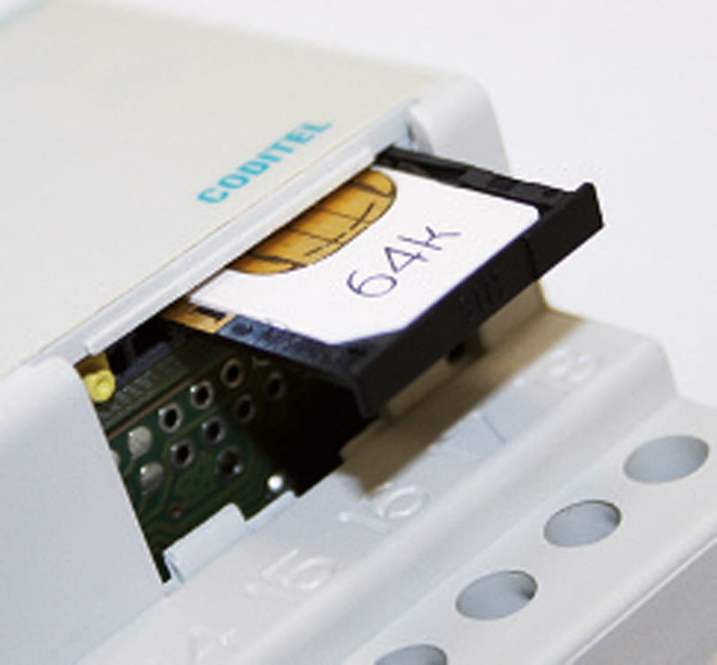 Dispositivo modulare che permette di comandare da remoto un cronotermostato, una caldaia, un fancoil, un climatizzatore o altra apparecchiatura elettrica. Con un comando inoltrato via SMS o gratuitamente attraverso lo squillo telefonico, è possibile pilotare l'accensione e lo spegnimento.\n - CODITEL gestisce le programmazioni tramite cellulare oppure direttamente dallo strumento\n - Tasto per la programmazione strumento/attivazione uscita con funzionalità che può assumere i valori:\n - RING alla pressione del tasto l'uscita si comporta come allo squillo\n - TOGGLE alla pressione del tasto l'uscita commuta ON/OFF in modo bistabile\n - Inoltre possiamo impostare l'invio di SMS di conferma dell'avvenuta commutazione oppure disabilitare questo servizio\n - Per installazioni in quadri schermati si ha la possibilità di remotare l'antenna all'esterno tramite l'accessorio antenna GSM LOG\n - Due indicatori LED:\n - Led Stato Uscita\n - Led Stato Dispositivo\n\nCARATTERISTICHE TECNICHE\n\n - Alimentazione: 230 V (±10%)\n - Frequenza nominale: 50 Hz\n - Assorbimento: 30 mA max\n - Collegamenti: Cavi con sezione max 6 mm2\n - Uscita un relè bistabile con contatto in scambio potere di interruzione: 8(5) A / 250 V AC\n - Segnalazione stato dispositivo:\n - Led rosso per segnalazione stato relè\n - Led multicolore rosso/verde\n - Modulo GSM: GSM Dual Band (900-1800 MHz)\n - Connettore: SMA-F per antenna esterna (in dotazione)\n - Numeri memorizzabili: Fino a 100\n - Temperatura di funzionamento: 0 +50 °C\n - Umidità di funzionamento: 10 +90% non condensante\n - Temperatura di immagazzinamento: -10 +65 °C\n - Grado di protezione: IP 40\n - Classe di isolamento: II\n - Contenitore: 4 moduli DIN