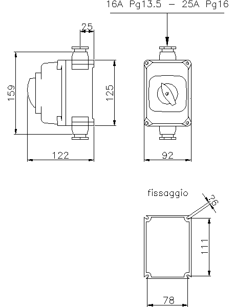 Interruttore stagno da parete, in contenitore in materiale termoindurente IP67. Morsetto di terra interno alla cassetta. Manopola lucchettabile.