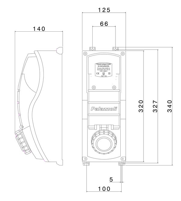 Presa da parete 24V con trasformatore di sicurezza, in contenitore modulare isolante termoindurente con doppio grado di protezione IP66/IP67 >IK10. Presa precablata con cavi lunghi 70cm spelati e numerati. Trasformatore con protezione termica incorporata, attivato tramite microinterruttore bipolare azionato dalla spina. Ingresso M25.