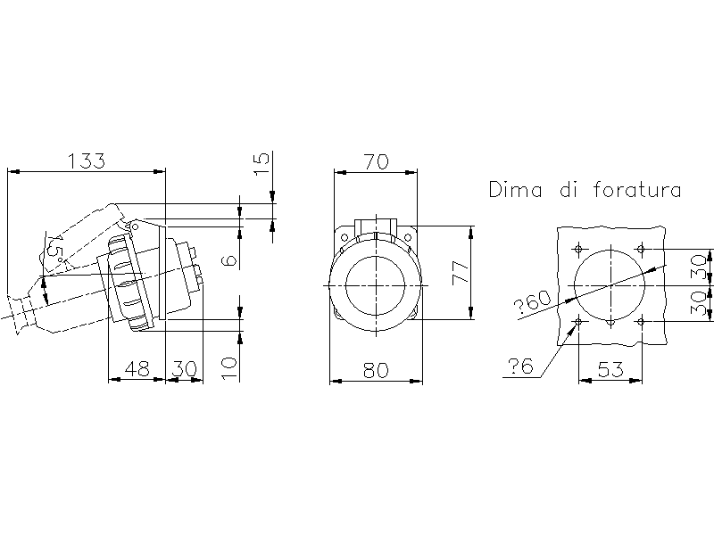 Presa da incasso inclinata stagna ad alte prestazioni bassa tensione. Guarnizioni in elastomero anti-invecchiante. Alveoli arrotondati ad inserzione agevolata. Adatta per impieghi frequenti in ambienti con presenza di urti, vibrazioni, agenti chimici, liquidi e polveri. Dimensioni flangia: 70x76.