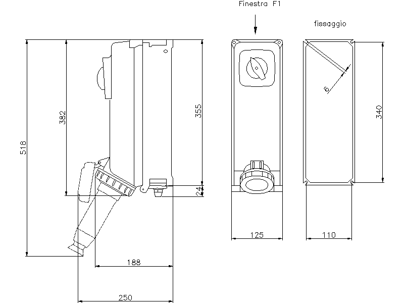 Presa da parete con interruttore magnetotermico, blocco meccanico, spia di segnalazione intervento in contenitore modulare in lega di alluminio IP55 >>IK10. Passaggio lato superiore con finestra tipo F1. Manopola lucchettabile.