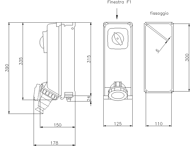Presa da parete con interruttore magnetotermico, blocco meccanico, spia di segnalazione intervento in contenitore modulare in lega di alluminio IP67 >>IK10. Passaggio lato superiore con finestra tipo F1. Manopola lucchettabile.