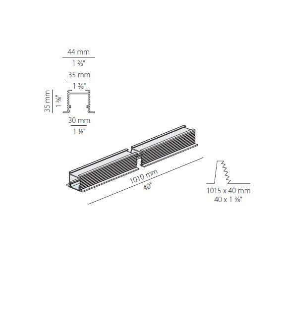 Profilo componibile per installazione incassata a soffitto o parete in ambienti interni, con emissione diretta. Struttura per l'incasso in cartongesso, in alluminio estruso con verniciatura a polvere in colore bianco RAL 9003. Schermo diffusore in policarbonato estruso microprismatico.. Moduli luminosi e alimentatore da ordinare separatamente. Accessori di fissaggio, giunzione e chiusura da ordinare separatamente. Dimensione del foro di incasso: 1015x40mm (40x1,6"). Potenza assorbita dal sistema max 46W/m. Sorgente luminosa LED. Distribuzione luminosa fascio diffuso. Alimentazione 24V DC. Driver remoto non incluso. Peso 0,6650Kg. Grado di protezione IP40.