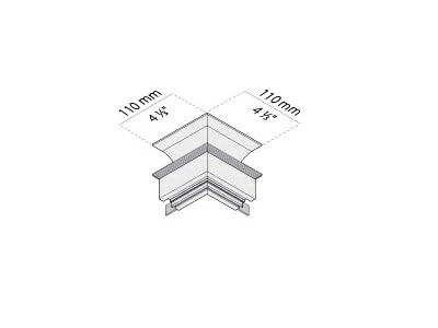 Elemento di collegamento per due linee di profili componibili con angolo 4 di giunzione orizzontale esterno di 90° per installazione incassta a scomparsa parete-parete / soffitto-soffitto misure esterne 110x110mm. Bianco opaco.