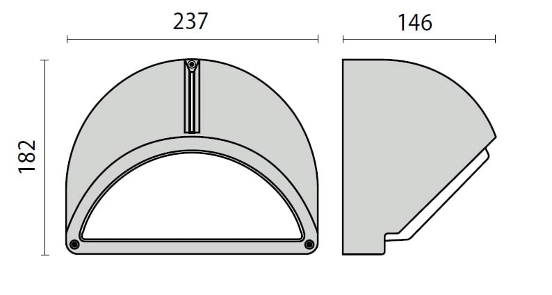 Apparecchio da parete per l'illuminazione orientata a 45°, per interni ed esterni, in due dimansioni, costituite da corpo in tecnopolimero, diffusore in vetro lavorato e satinato internamente, viti di chiusura in acciaio inox, l'interasse di fissaggio permette l'installazione sulle scatole da incasso o per frutti.