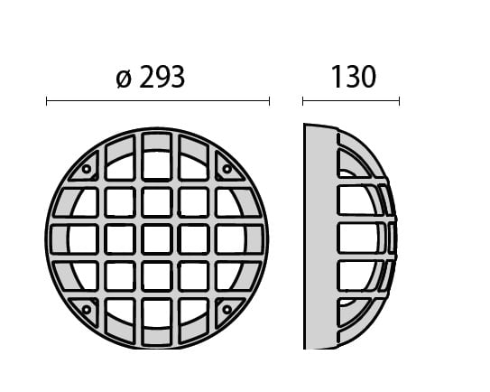 Serie di apparecchi da parete e soffitto per interno ed esterno, in tre dimensioni, costituiti da : Corpo, anello e schermi in alluminio pressofuso verniciato. Diffusore in tecnopolimero opale antivandalo, filo incandescente 960° C. Staffa portacablaggioin alluminio per le versioni fluorescenti. Guarnizione in EPDM. Anello e schermi sono solidali con il diffusore. Viti di chiusura in acciaio inox. Apparecchio non predisposto per cablaggio passante