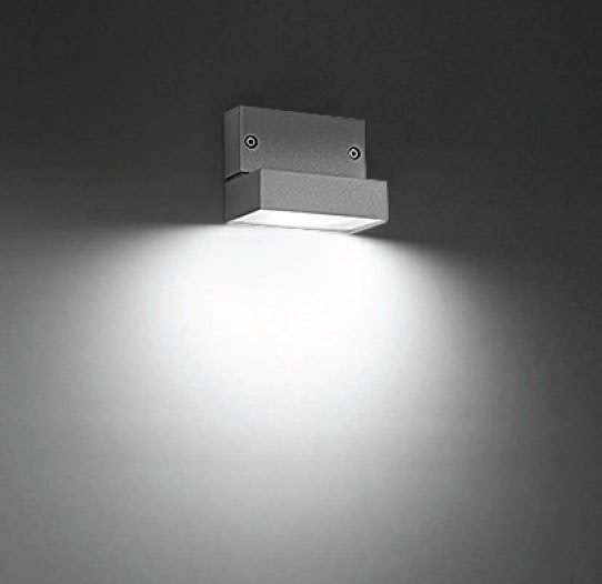 Apparecchio da parete per interni ed esterni costituito da: Corpo in alluminio pressofuso, verniciato. Diffusore in vetro piano extrachiaro temperato, serigrafato e satinato internamente. Guarnizione in silicone. Modulo LED a tensione di rete 220-240V 50/60Hz protetto per sovratensioni fino a 500V. Viti di chiusura in acciaio inox. Adatto per installazioni che richiedono apparecchi anti inquinamento luminoso. Colore / RAL: AN-96 / Antracite metallizzato / Goffrato. Ottica: simmetrica diffondente. Lampada: LED 6.5W 742Lm 4000K.