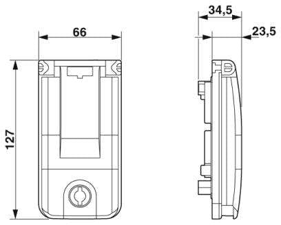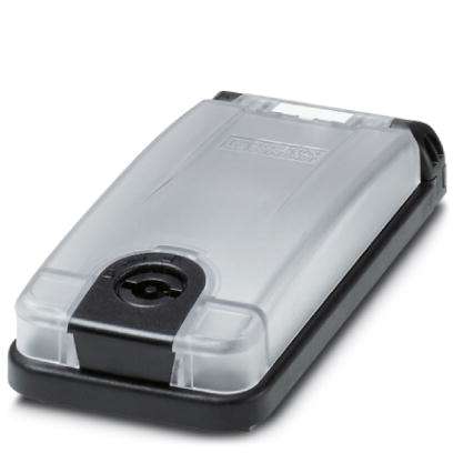 Telaio da incasso per una piastra frontale/presa, telaio: nero, coperchio: trasparente, chiusura con testa doppia da 3 mm e manopola chiusa.