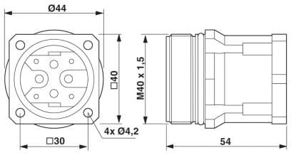 Connettore per apparecchi anteriore, diritto, Bloccaggio a vite, M40, numero poli: 4+3+PE, tipo contatti: Maschio, Attacco a crimpare, O-ring assiale, 4x Ø4,2, schermata: sì, misura flangia: 40 mm x 40 mm, diametro cavi: 0 mm... 0 mm