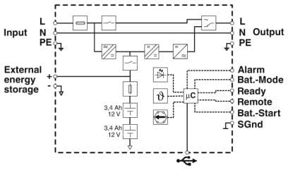 Transizione senza problemi grazie alla curva sinusoidale pura: il seno generato nel funzionamento a batteria si sincronizza con la rete di alimentazione precedente. Compatto: il modulo UPS e la batteria riuniti in un'unica custodia. Lunghi tempi di copertura con la batteria VRLA integrata, possibilità di espansione con altre batterie. Interfaccia USB per il collegamento a controllori di livello superiore, come ad esempio i PC industriali. Avviamento da batteria possibile anche senza rete di ingresso.