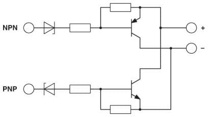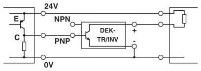 Modulo invertito. Il modulo è preposto alla conversione dei segnali d’uscite transistor NPN in uscite PNP con interruzione del segnale positivo, così come segnali con interruzione PNP in segnali con commutazione NPN con interruzione del segnale negativo (vedere esempio applicativo).