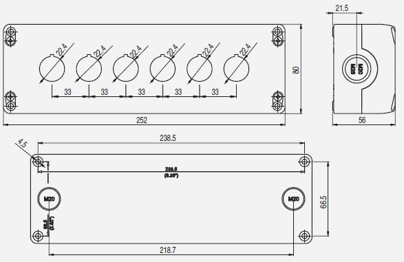 Scatola in policarbonato antiurto autoestinguente a doppio isolamento, resistente ai raggi UV caricato fibra vetro, con elevata resistenza agli urti. Idonea per il montaggio dei dispositivi di comando e segnalazione Ø 22 mm • Dimensioni: 252x80 H:56