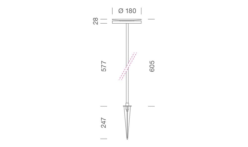 CHIODO - H. 605 mm - 3000K - Testa in alluminio trattato e verniciato nero. Asta in alluminio rivestito in fibra di carbonio. Picchetto per il fissaggio nel terreno in acciaio inox AISI 316. Protezione con trattamento di anodizzazione, fondo con polveri epossidiche e verniciatura poliestere. Schermo in PMMA opale diffondente. Assenza di viti a vista. Alimentatore: 220-240V 50/60Hz. Apertura di fascio: Largo. Ottica: 95°. LED COB Bianco 11 W 710 lm 3000K. Finitura nero.