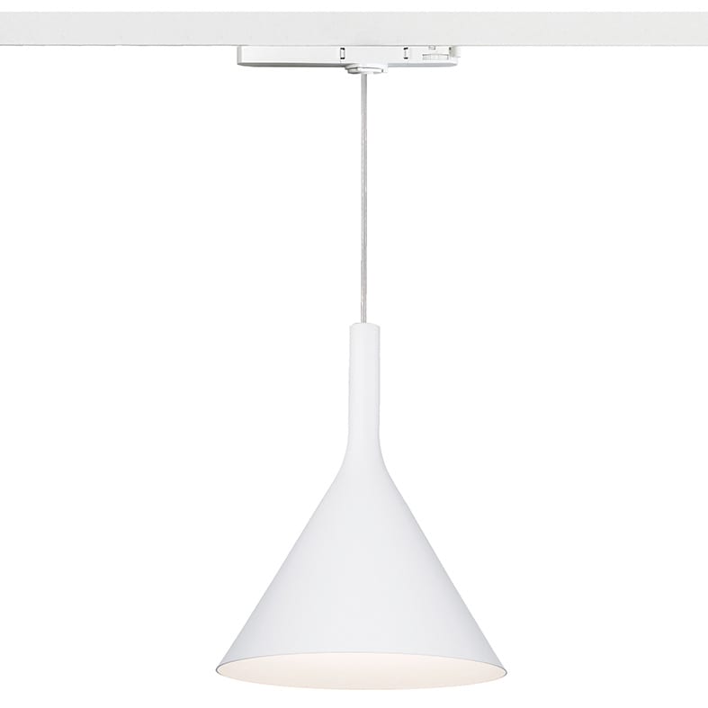 Lampada a sospensione a forma conica in metallo verniciato a polveri, progettata in due differenti misure, in finitura bianca o nera, con interno bianco o oro satinato. Disponibile in versione singola (cavo di sospensione nero o trasparente), con kit decentramento a tre o cinque elementi (cavo in tinta con il corpo lampada) o con possibilit? di decentramento dal punto luce. Soluzione disponibile a nche per binario SQUASH, SQUASH PRO e GROOVE EVO.Attacco E27 che consente di montare lampadina LED.