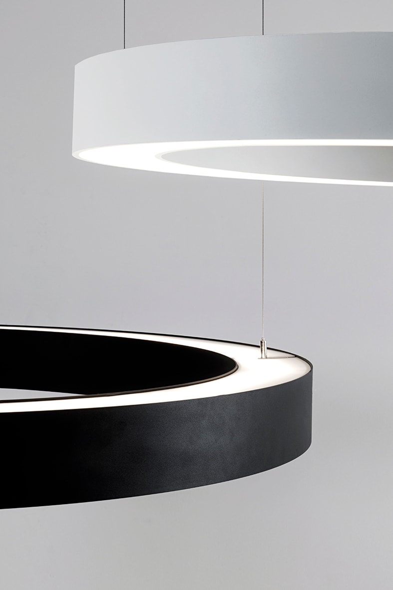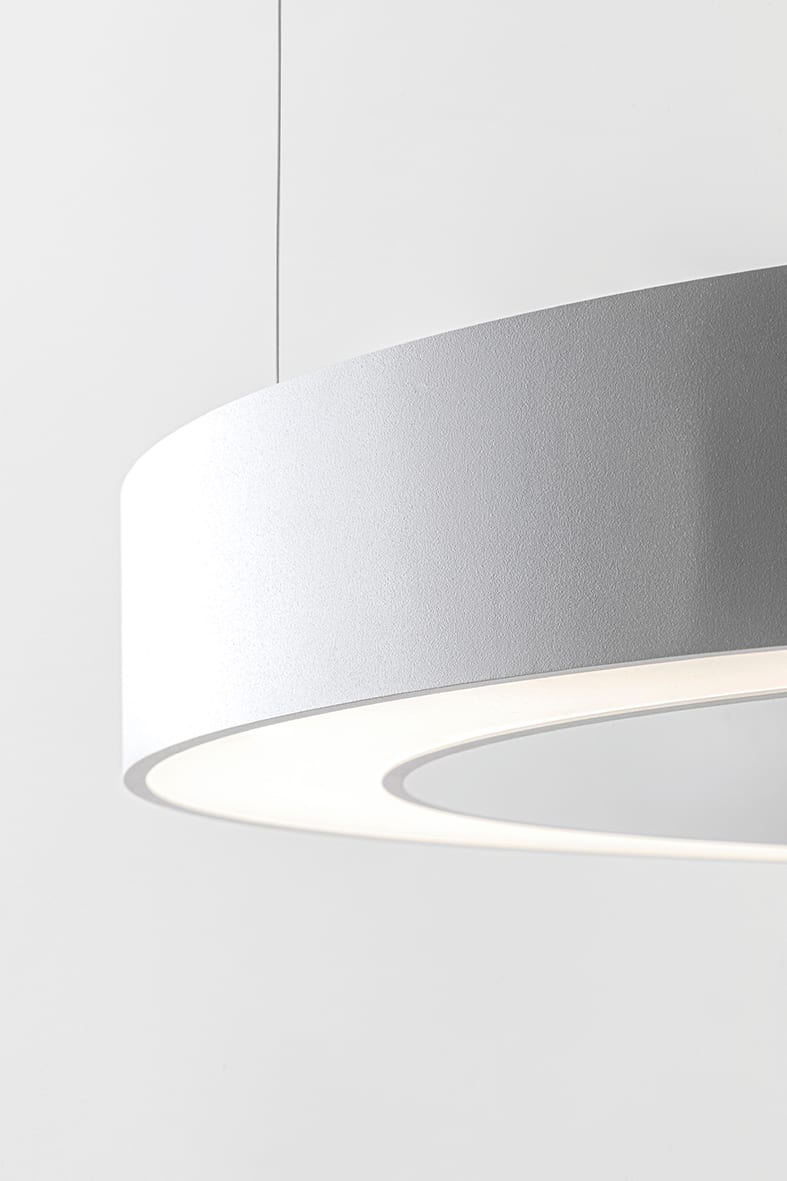 Lampada a LED per applicazione a plafone monoemiss ione o a sospensione monoemissione e biemissione.Struttura ad anello in alluminio e diffusore in policarbonato opale per una diffusione ottimale e uniforme della luce senza abbagliamenti e ombre. Grazie al suo design minimal e alla sua efficienza energetica ? perfetta per illuminare hotel, ristoranti e sale riunioni Disponibile in due misure con relative potenze, due finiture (bianco e nero), due temperature colore (3000K e 4000K) e nella versio ne DALI.