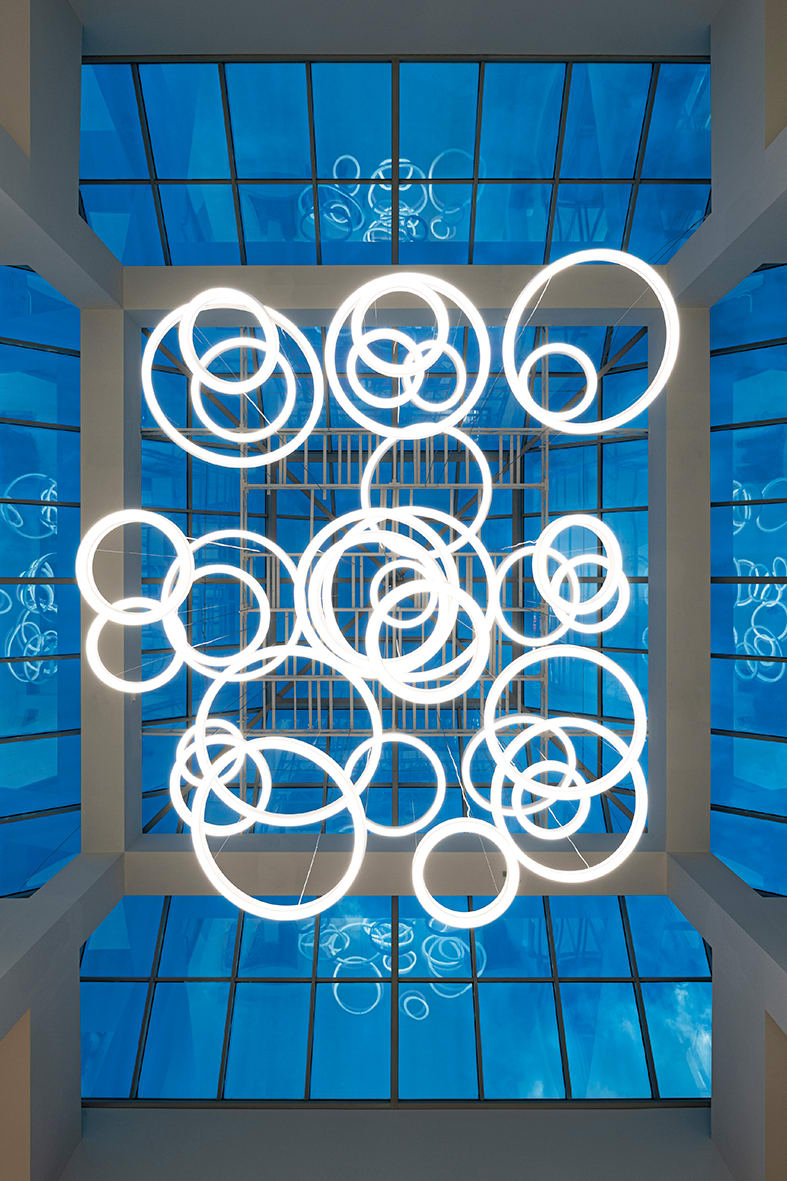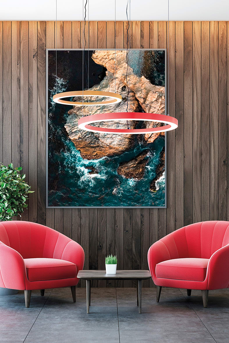 Lampada a LED per applicazione a plafone monoemiss ione o a sospensione monoemissione e biemissione.Struttura ad anello in alluminio e diffusore in policarbonato opale per una diffusione ottimale e uniforme della luce senza abbagliamenti e ombre. Grazie al suo design minimal e alla sua efficienza energetica ? perfetta per illuminare hotel, ristoranti e sale riunioni Disponibile in due misure con relative potenze, due finiture (bianco e nero), due temperature colore (3000K e 4000K) e nella versio ne DALI.