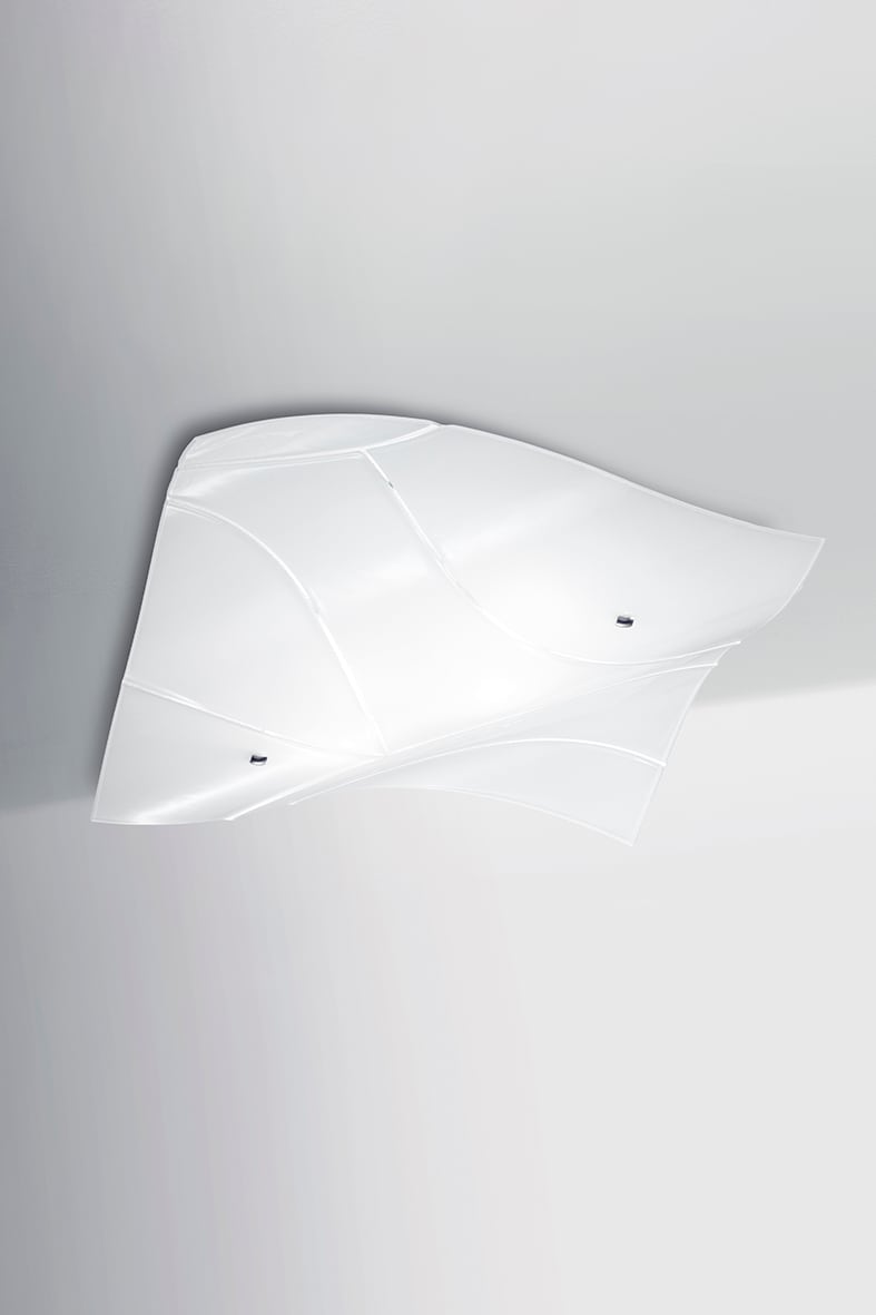 Lampada a soffitto con attacco E27 dal design moderno che richiama le morbide forme di una foglia. Diffusore in vetro fusione extrachiaro con venature in rilievo. Montatura e rosone in metallo cromato .
