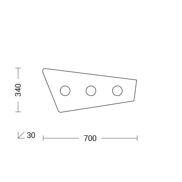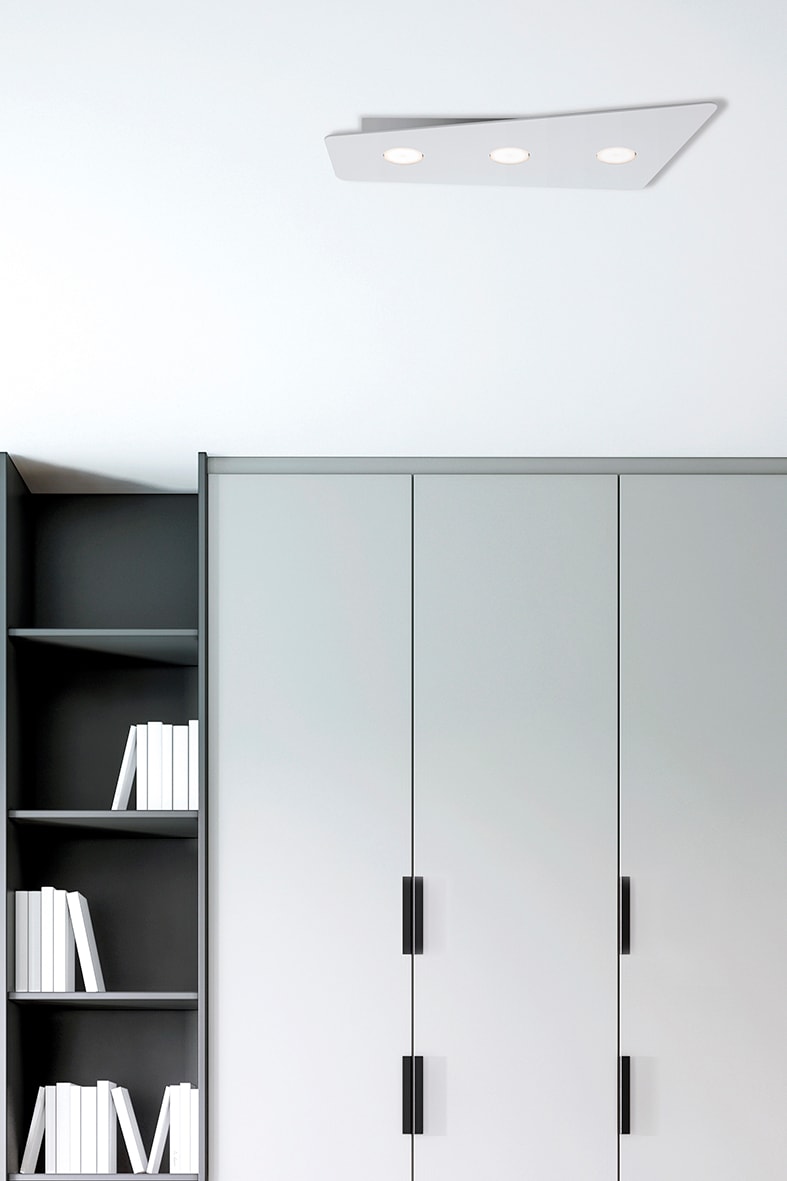 Lampada da soffitto e da parete con struttura in metallo e pannello sottile, trapezoidale in PMMA lu cido con due, tre o quattro portalampada. Cablatacon attacco GX53 consente di montare lampadina LED. Disponibile in tre misure e in due finiture (bianco e nero). Prodotto versatile, ideale in abitazioni moderne per illuminare la sala da pranzo, l'ingresso o le parti comuni con installazioni multipl e