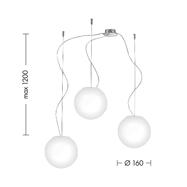 Lampada da soffitto o da parete, a sospensione, da tavolo e da terra con diffusore tondo in vetro so ffiato satinato, per un?ottima propagazione dellaluce. Disponibile in diversi diametri. Nella soluzione sospesa viene proposta in versione singola con rosone bianco, o in caduta multipla a tre elementi con kit di decentramento in finitura cromo. Per la versione da soffitto, a sospensione e tavolodisponibile con LED integrato (2700K) o con attacco E14 e E27 che consentono di montare lampadina LED. La piantana con treppiede in finitura bianca op aco ? proposta nella versione E27.
