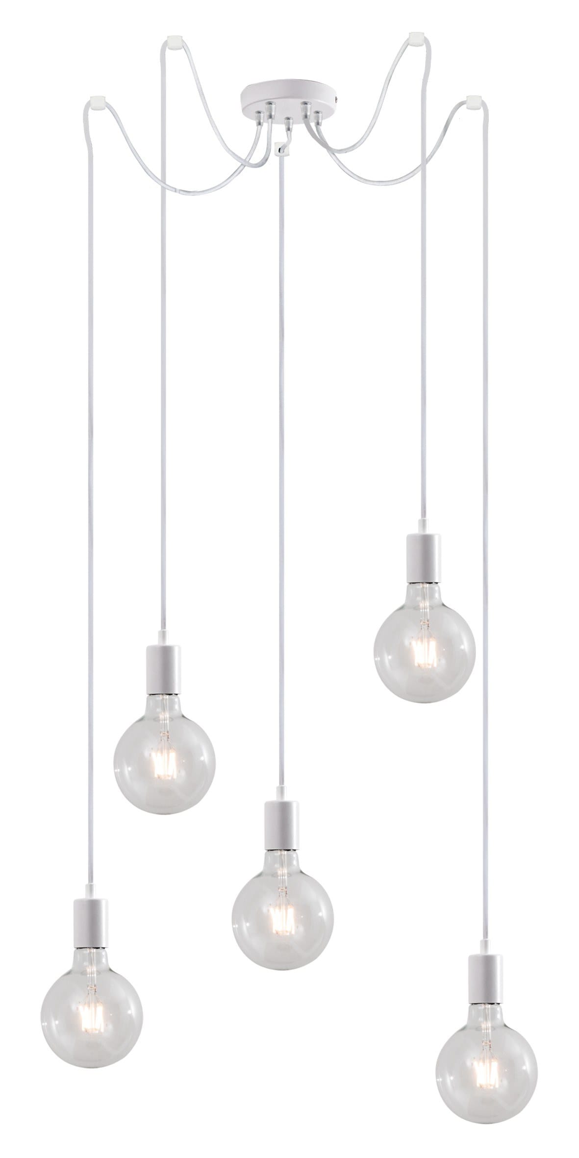 Lampada a sospensione da 1, 3, 5 luci dal design minimale, composta da portalampada in alluminio e r osone in tinta, proposti nei colori bianco o neroopaco, bronzo satinato, cromo e rame lucido. Forni ta con cavo elettrificato in tessuto proposto neicolori bianco, nero, rosso e bronzo in associazione al colore del portalampada. Attacco E27 con lampadina a vista, che consente di personalizzare ulteriormente il prodotto montando una lampadina a vis ta a LED a scelta.
