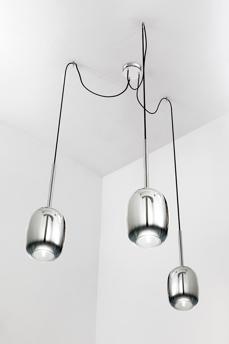Lampada a sospensione composta da un elegante diffusore in vetro pirex dalla forma ovale, sabbiato all?interno. Disponibile in quattro finiture (crist allo, cromo sfumato, bronzo lucido e oro lucido),da comporre con cavo in PVC trasparente o in tessuto (disponibile nei colori rosso, verde militare e nero) per creare nuances e abbinamenti dal forte impatto visivo. Proposta nella versione singola oin cadute multiple, sia con rosone (a 3 e 6 feritoie) che con kit di decentramento (a 3 e 5 elementi) per unamassima personalizzazione e per creare eleganti giochi di trasparenze. Attacco G9 che cons ente di montare lampadina a LED.