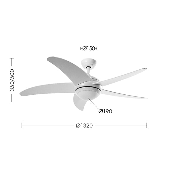 Ventilatore a soffitto a LED con CCT settabile per selezionare la temperatura colore preferito. Cinque pale in legno verniciato grigio o bianco e struttura in alluminio grigio o bianco. Dotato di telecomando a onde radio per la regolazione della velocit?, invertitore di marcia estate-inverno e accen sionespegnimento della luce.