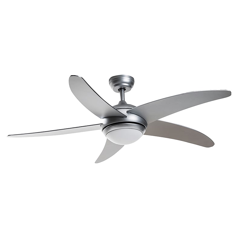 Ventilatore a soffitto a LED con CCT settabile per selezionare la temperatura colore preferito. Cinque pale in legno verniciato grigio o bianco e struttura in alluminio grigio o bianco. Dotato di telecomando a onde radio per la regolazione della velocit?, invertitore di marcia estate-inverno e accen sionespegnimento della luce.