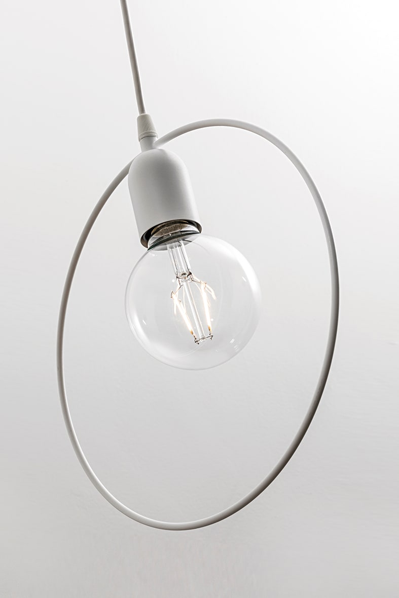 Lampada a soffitto e a sospensione con struttura dalla forma circolare in metallo, disponibile in finitura cromata, bianca e nera opaca. Nella versione a sospensione il rosone ? in tinta con la struttura, il cavo di sospensione ? trasparente per la v ersione cromo e in tinta per le finiture bianca enera.Attacco E27 che consente di personalizzare ulteriormente il prodotto montando una lampadina a v ista a LED a scelta.