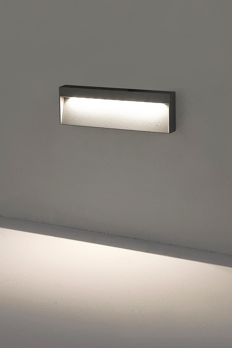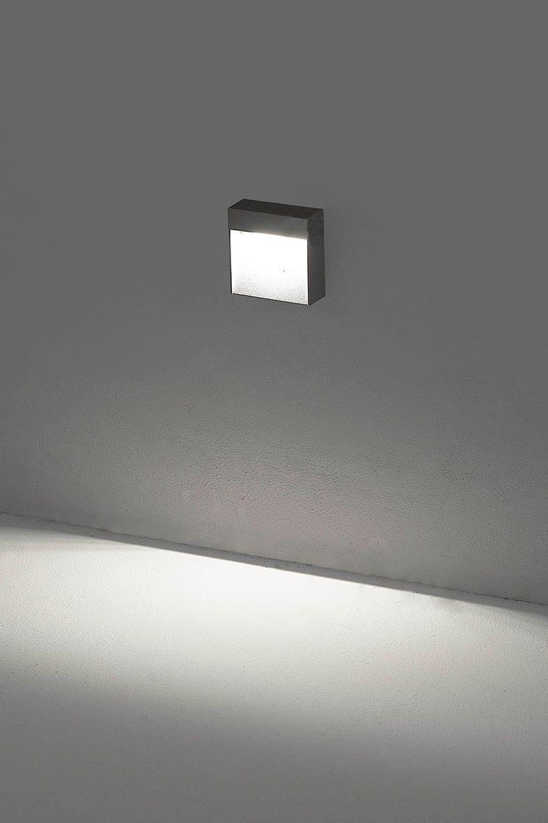 Segnapasso LED a parete per esterno (IP65), adatto anche per pareti in muratura dove non ? possibile inserire un prodotto ad incasso. Struttura in pressofusione di alluminio verniciato con polveri poliestere ad elevata resistenza ai raggi ultraviolet ti e alla corrosione. Fascio di luce direzionatoverso il basso. Disponibile in versione quadrata e rettangolare, tre finiture (bianco, grigio e antracite) e due temperature colore (3000K e 4000K). Disponibili giunti certificati IP68 per la realizzaione delle connessioni elettriche, sicure, durevol i e con barriera anticondensa.