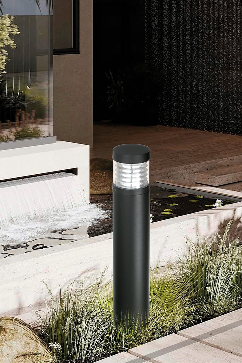 Paletto LED da terra per esterno (IP65), struttura in pressofusione di alluminio, verniciato con polveri poliestere ad elevata resistenza ai raggi ultravioletti e alla corrosione. Diffusore in policarbonato con griglia frangiluce. Alimentatore LED in tegrato. Disponibile in due altezze, due finiture(antracite, grigio) e due temperature colore (3000K e 4000K). Disponibili giunti certificati IP68 per la realizzazione delle connessioni elettriche, s icure, durevoli e con barriera anticondensa.