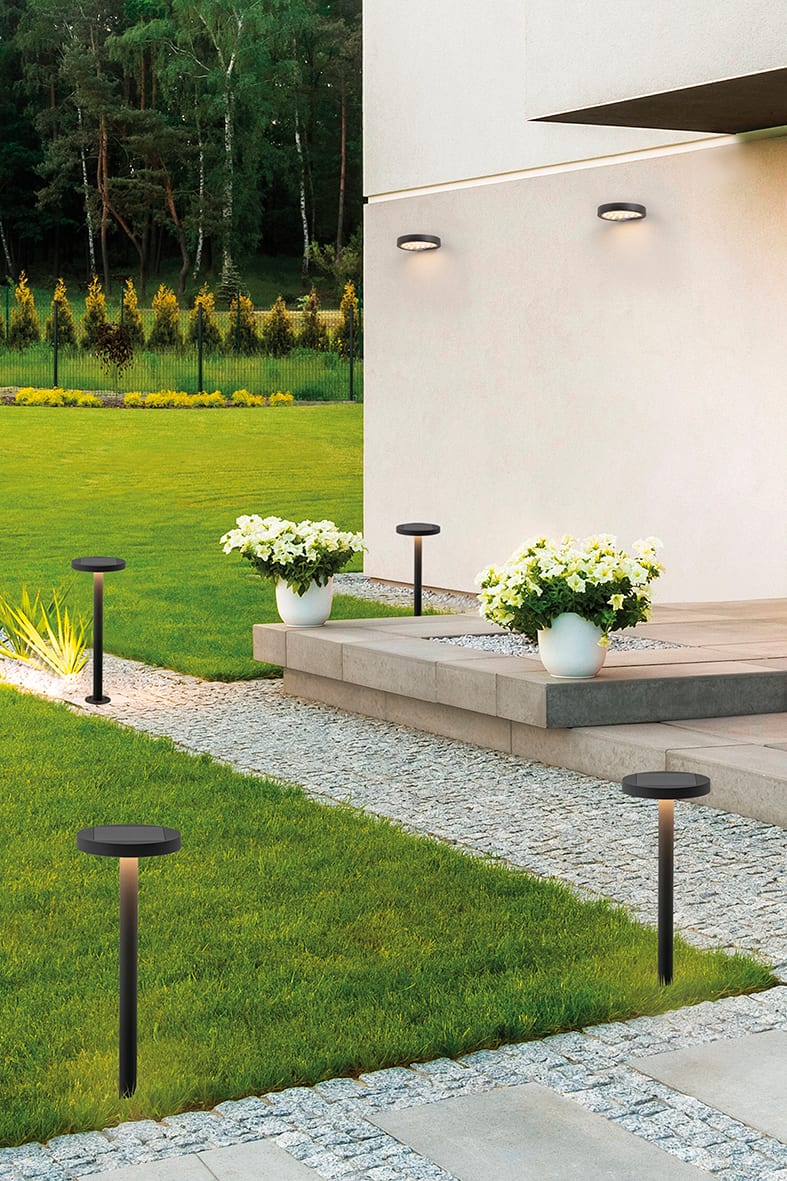 Paletto da terra e apparecchio da parete LED (3000K) a ricarica solare, ideale per illuminare giardini e terrazze in modo pratico, suggestivo e scenografico. Struttura in pressofusione di alluminio verniciato con pretrattamento per uso esterno (IP54) e diffusore in policarbonato, Nap si caratterizza per la fonte luminosa LED con pannelli solari inpolicristallino integrati, ricaricabili con luce solare per un effetto di luce diffusa fino a 20 ore di autonomia. Entrambi sono dotati di pulsante diaccensione e spegnimento manuale per un utilizzo efficiente della batteria e sensore crepuscolare in telligente con dimmerazione stepless. Possibilit? di installazione del paletto su plinto in cementoo nel terreno con picchetto e dell'apparecchio a parete con relativi fissaggi inclusi. Disponibile n ella finitura antracite.