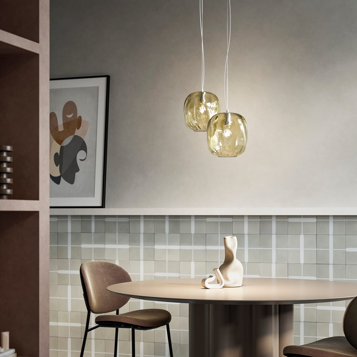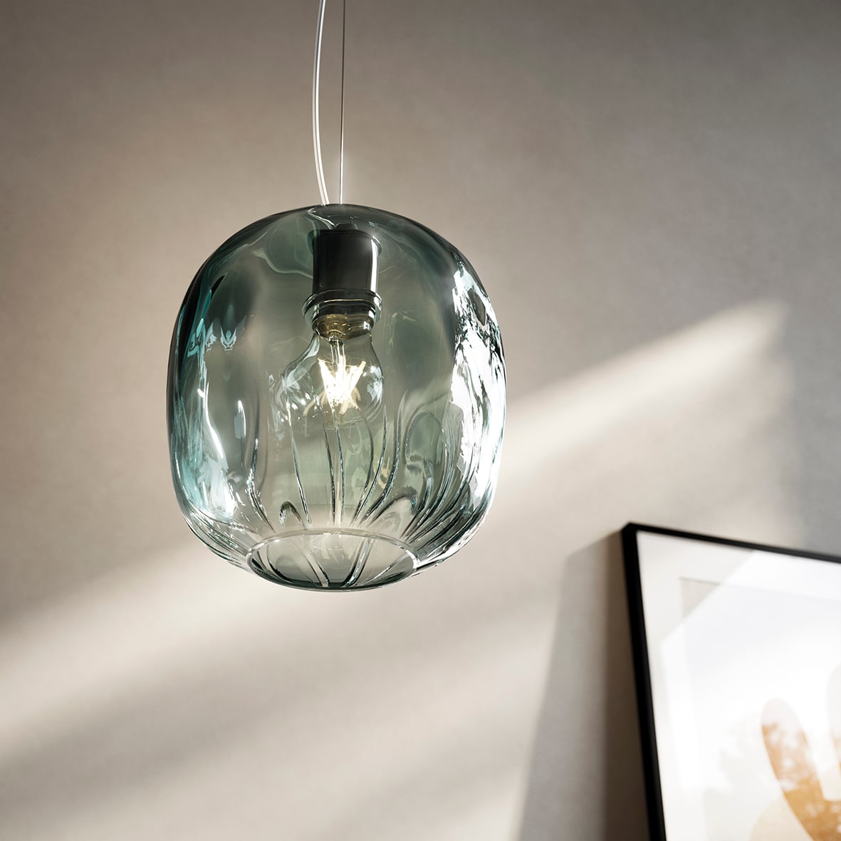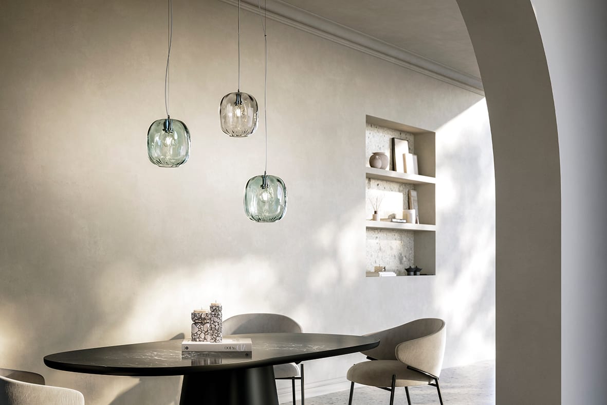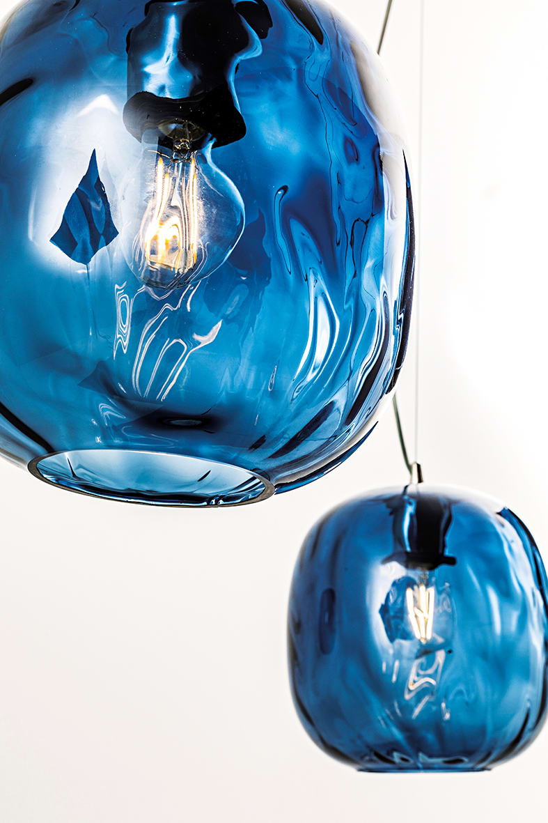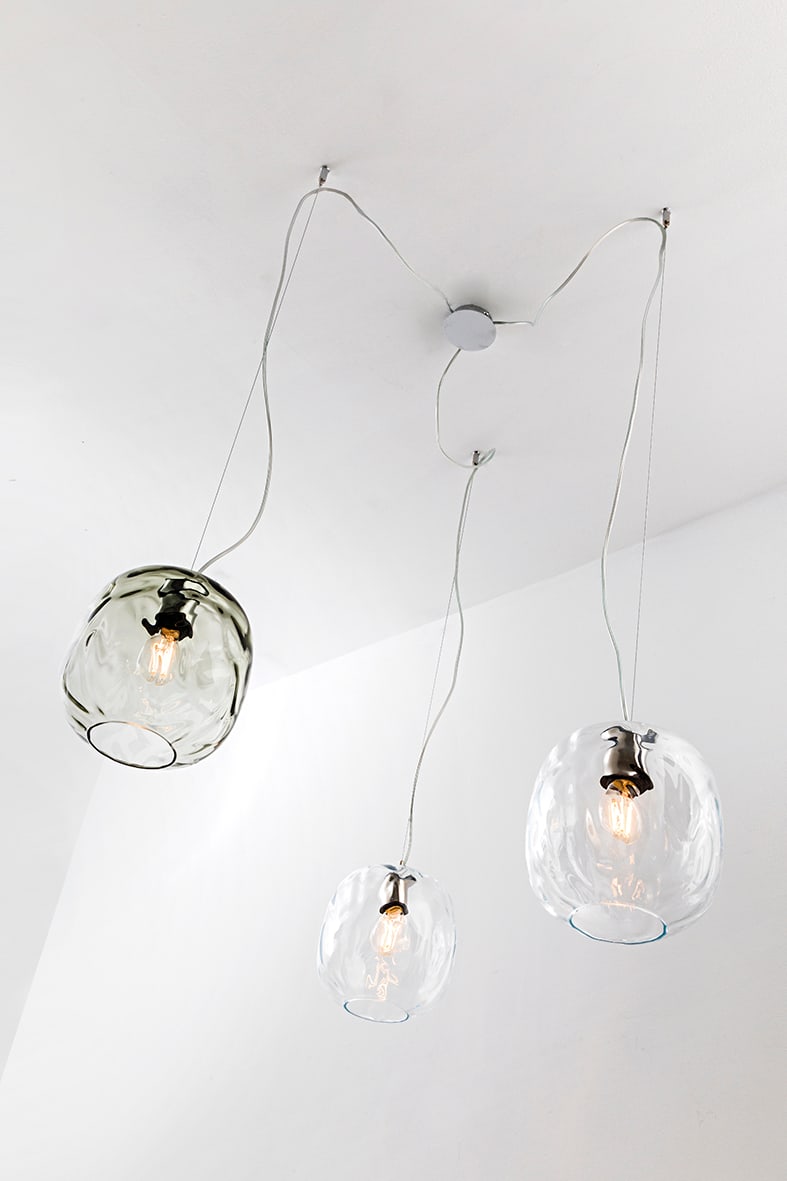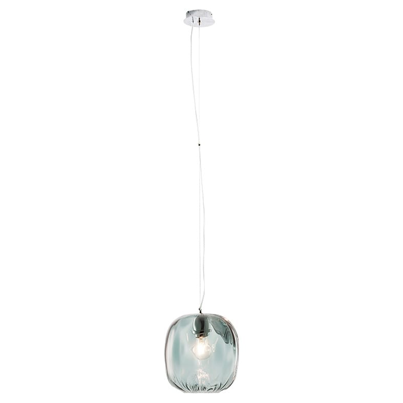 Lampada a sospensione composta da un prezioso diffusore in vetro trasparente soffiato a mano. Disponibile in cinque finiture (bronzo, petrolio, trasparente, fum? e blu), proposta in versione singola o con rosone per cadute multiple. Attacco E27 che c onsente di montare lampadina a LED.