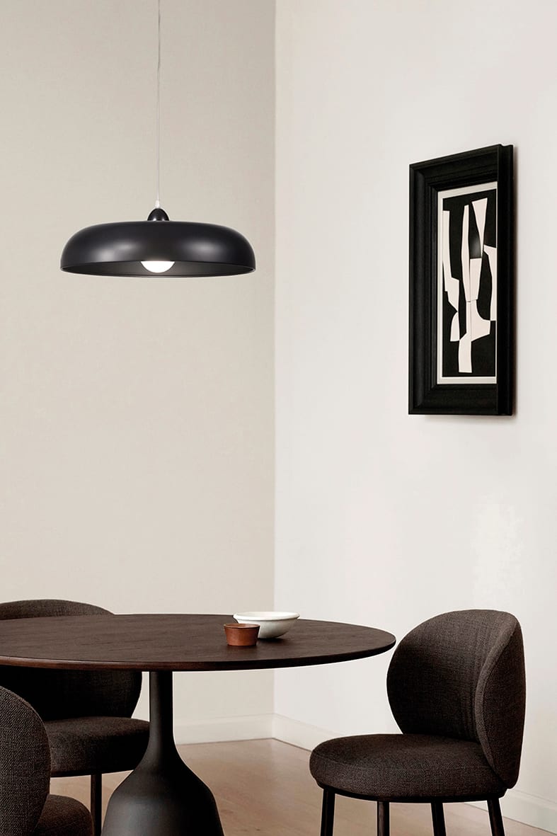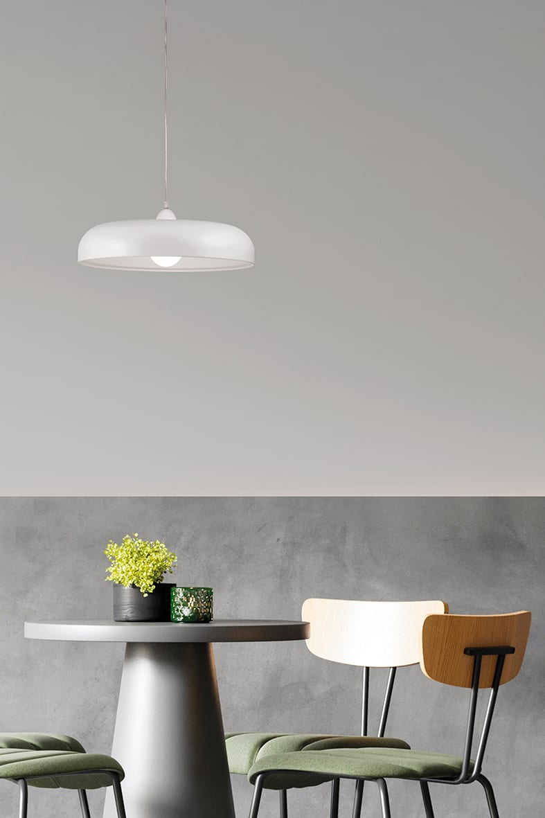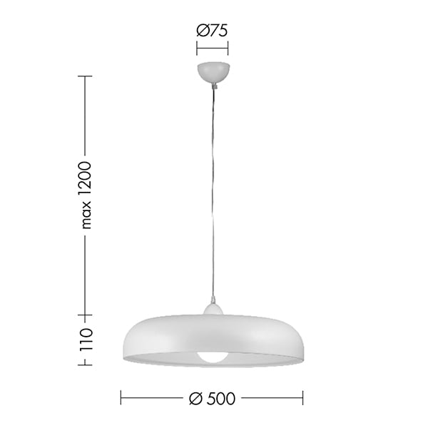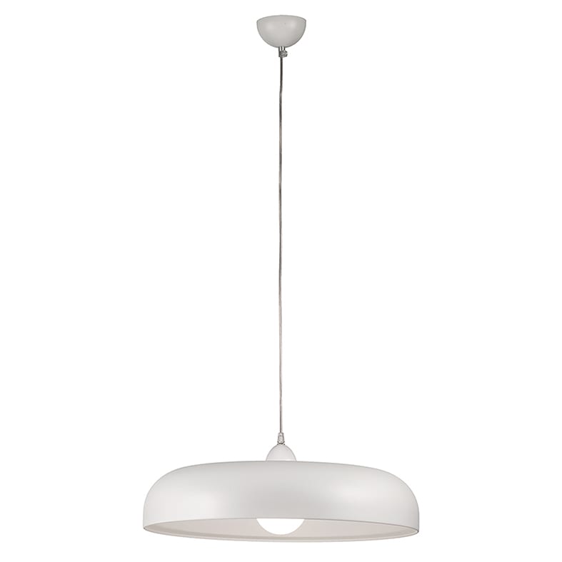 Lampada a sospensione con diffusore in metallo, portalampada E27 che permette di montare lampadina L ED. Disponibile nei colori bianco e nero, internoed esterno, portalampada e rosone in tinta. Cavo i n PVC trasparente.