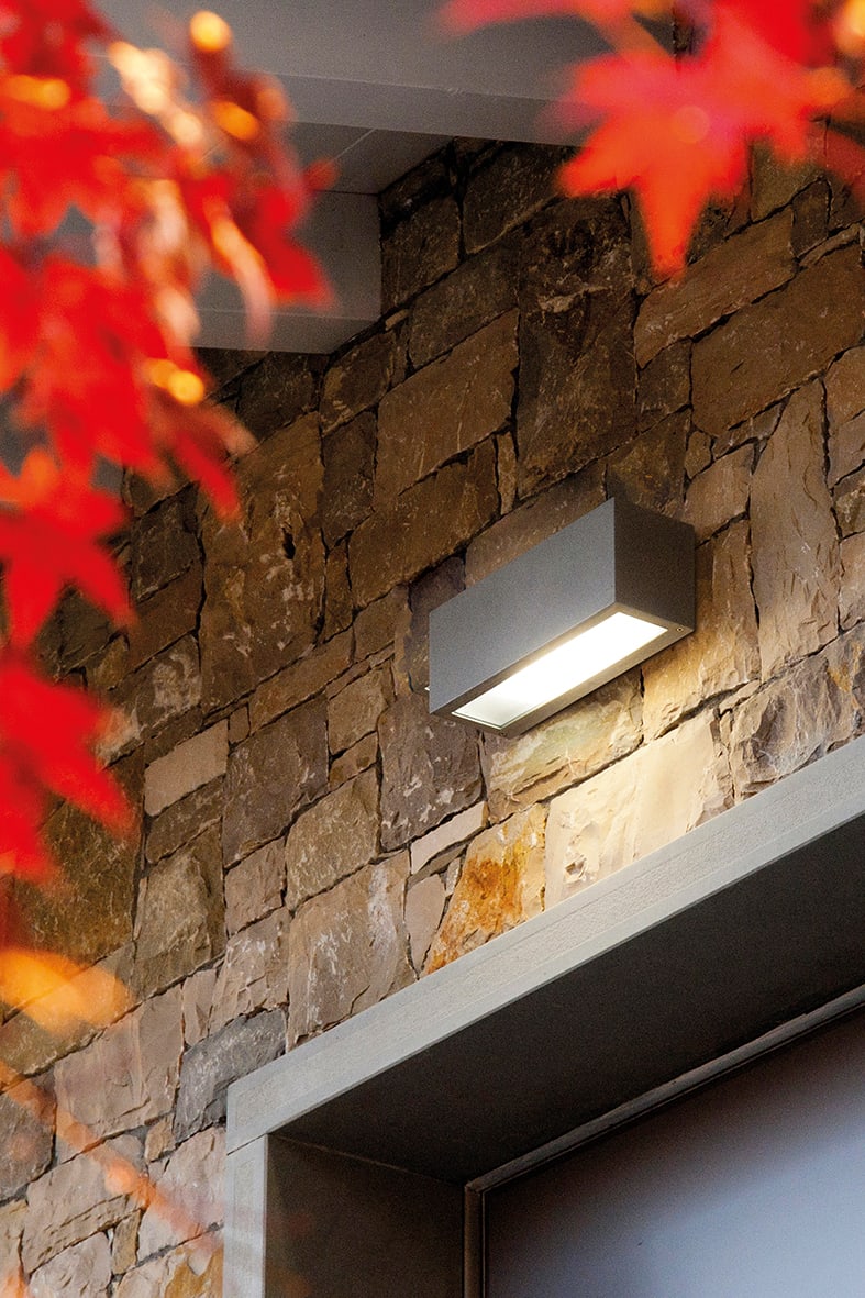 Apparecchio LED a parete per esterno (IP65) monoem issione o biemissione. Struttura in pressofusione di alluminio verniciato con polveri poliestere adelevata resistenza ai raggi ultravioletti e alla c orrosione, diffusore in vetro temperato. Propostain tre finiture (bianco, grigio e antracite) e due temperature colore (3000K e 4000K). AlimentatoreLED integrato. Disponibili giunti certificati IP68 per la realizzazione delle connessioni elettriche , sicure, durevoli e con barriera anticondensa.