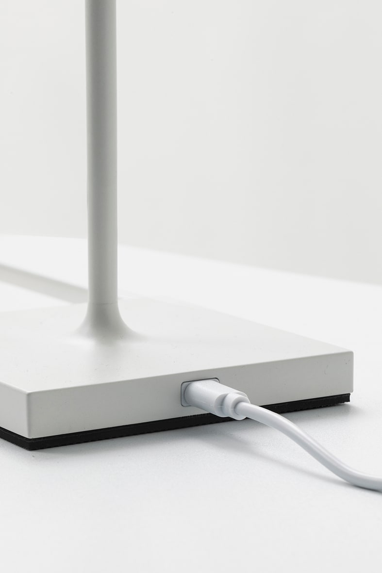 Lampada da tavolo a LED (2700K), portatile e ricaricabile. Ideale per ambienti outdoor, si presta ottimamente anche per utilizzo in interno. Grazie all'emissione di luce confortevole e modulabile, ? perfetta per il tavolo da pranzo o l'angolo conversazione, in ambiente domestico ma anche nel mondo della ristorazione. Struttura in pressofusione di alluminio verniciato a polvere con pretrattamento per uso da esterno (IP54), cover led in policarbonato e guarnizione in gomma siliconica. Accensione con interruttore touch dimmer e ricarica tramite cavo USB-C ad attacco magnetico posto sulla base della lampada. La batteria ha una durata di 9 ore, con avviso di batteria scarica. E? possibile selezio nare la temperatura colore con un semplice gesto:con un tocco la lampada si accende a 2700K, il secondo tocco cambia a 3000K, al terzo tocco la lampada si spegne. Disponibile in dieci varianti colore: bianco, nero, corten, blu, Tiffany, verde bosco, pearl beige, grigio, rosso e oro.