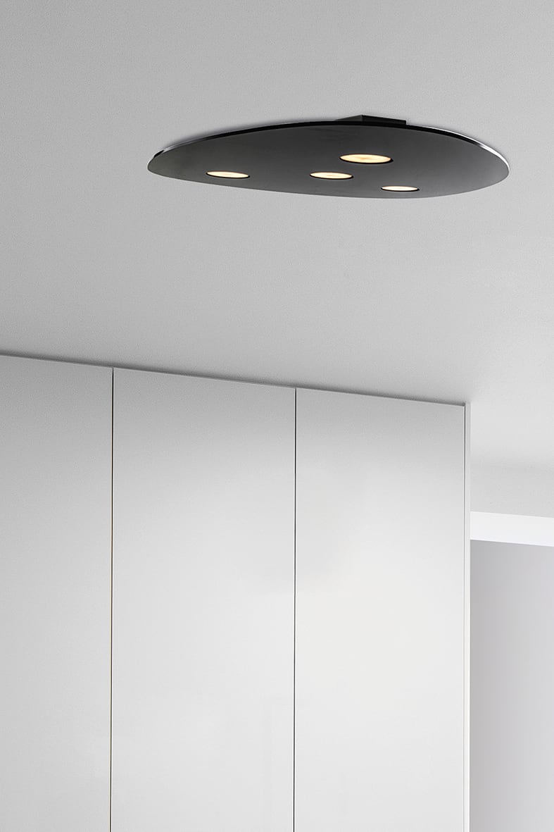 Lampada da soffitto, da parete e sospensione con struttura in metallo e pannello sottile tondeggiante in PMMA lucido con tre o quattro portalampada per la versione da soffitto e parete, con quattro po rtalampada per la versione a sospensione. Cablatacon attacco GX53, consente di montare lampadina LED e disponibile in due misure e in due finiture (bianco e nero opaco). Prodotto versatile, ideale in abitazioni moderne per illuminare la sala da pranzo, l?ingresso o le parti comuni con installazioni multiple.