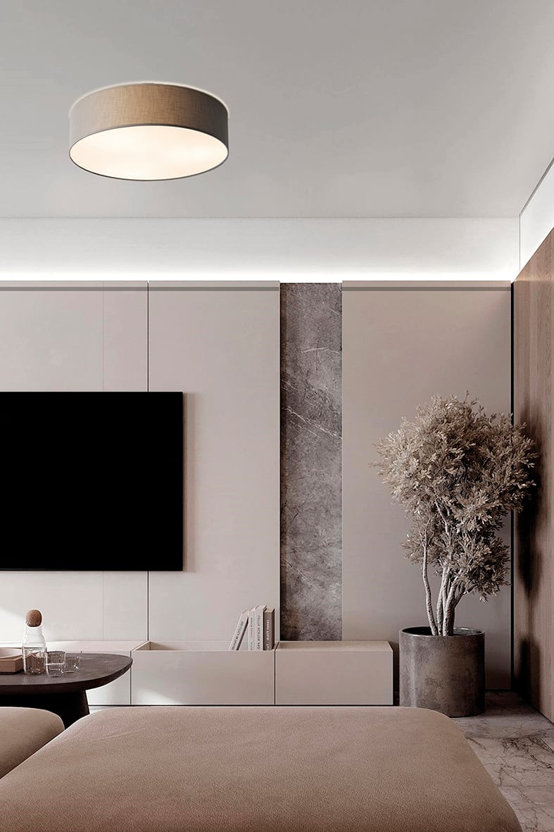 Lampada a sospensione, a plafone, da parete, da ta volo e da terra con paralume in tessuto con formacilindrica o conica, struttura in metallo verniciato bianco o nero con cavi in PVC in tinta. La vers ione a plafone ? proposta anche con braccio fissoper punti luce decentrati. Le quattro diverse finiture (avorio, tortora, antracite e grigio) e l?attacco E27 che consente di montare lampadina LED, la rendono perfetta per illuminare ogni angolo della casa.