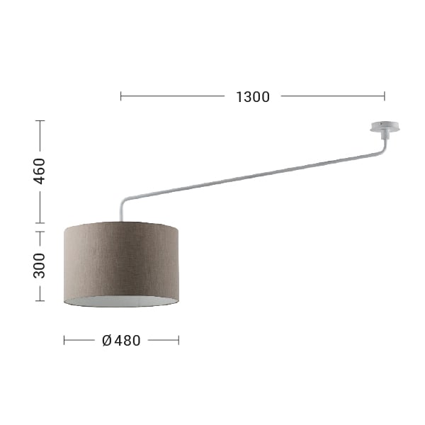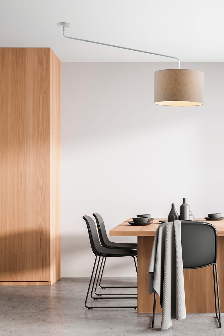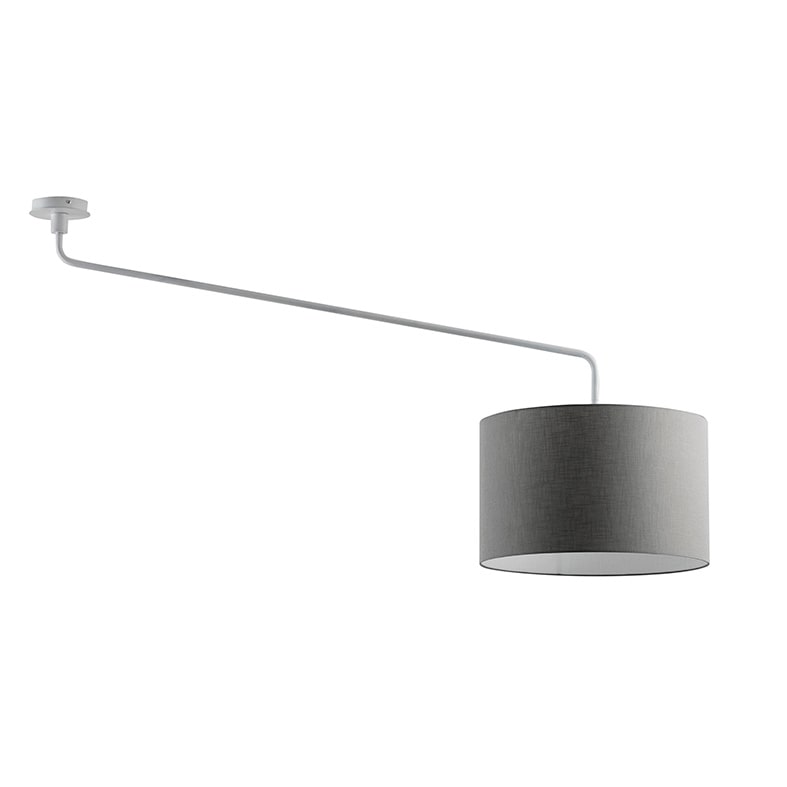 Lampada a sospensione, a plafone, da parete, da ta volo e da terra con paralume in tessuto con formacilindrica o conica, struttura in metallo verniciato bianco o nero con cavi in PVC in tinta. La vers ione a plafone ? proposta anche con braccio fissoper punti luce decentrati. Le quattro diverse finiture (avorio, tortora, antracite e grigio) e l?attacco E27 che consente di montare lampadina LED, la rendono perfetta per illuminare ogni angolo della casa.