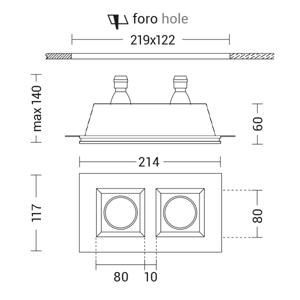Faretto ad incasso in gesso rasato a scomparsa totale con attacco GU10 che consente di montare lampadina LED. Struttura quadrata, singola o doppia. La versione singola ? disponibile anche con luce laterale fissa inclinata di 45?. Per la versione 9831 cassaforma per installazione in muratura da ordin are come accessorio.
