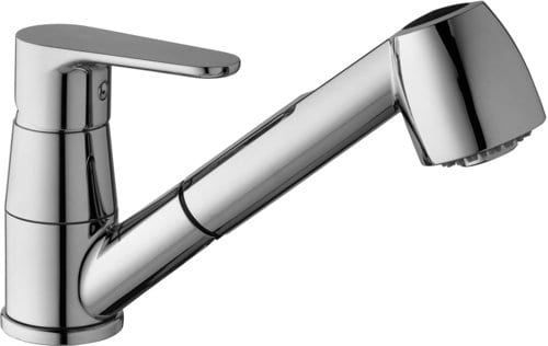 Miscelatore lavello monoforo con canna orientabile e doccia estraibile (2 getti) in ABS, completo di: • set 2 flessibili inox 3/8”G • 1 flessibile inox M15x1 • 1 flessibile nylon 1/2”G x M15x1 cm. 150 con piombo. Finitura cromo