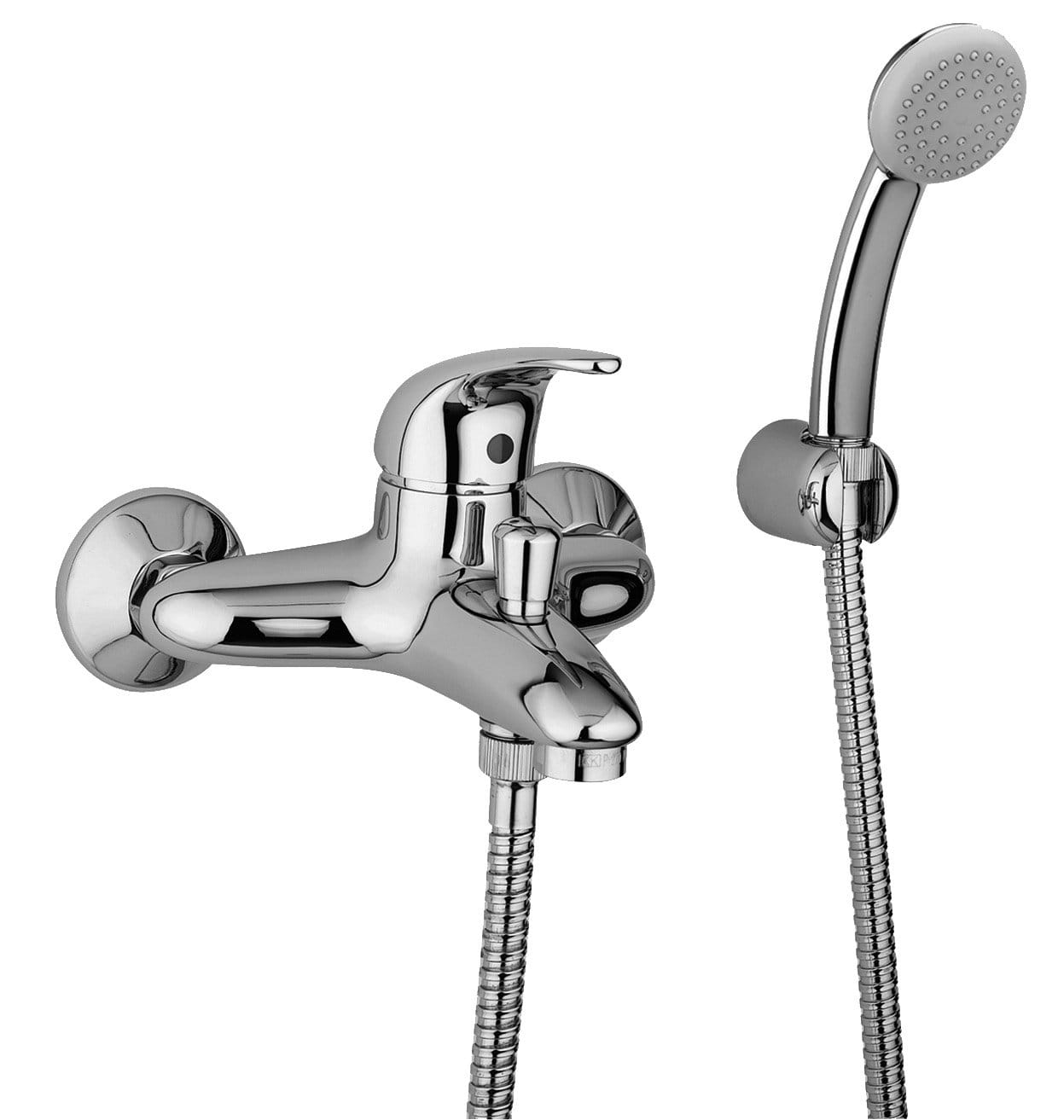 Miscelatore vasca/doccia con deviatore e con supporto a muro fisso in ABS con doccia e flessibile, completo di: • aeratore M28x1 • set 2 eccentrici 1/2”x3/4”G e rosoni. Finitura cromo