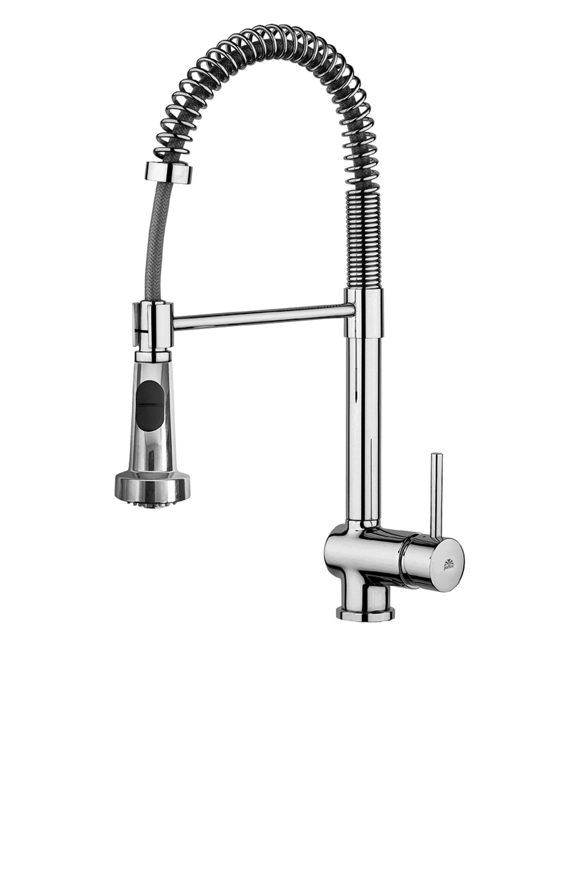 Miscelatore lavello monoforo professional con canna orientabile e con doccia Happy (2 getti) in ABS, completo di: • set 2 flessibili inox 3/8”G. Finitura cromo