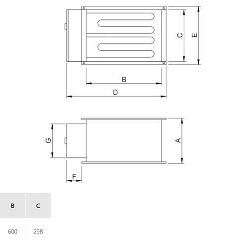 Batteria di riscaldamento elettrico da montare alla mandata dei ventilatori in linea DIRECT-AIR. Equipaggiata con resistenze elettriche corazzate (230V - 3W/cm2), di un termostato di sicurezza a riarmo automatico (90ºC) montato in serie con un altro termostato di sicurezza (120ºC) a riarmo manuale (RESET). La scatola per i collegamenti è sempre installata su un fianco. Le resistenze sono precablate per essere collegate a una rete 3/400V, il circuito di protezione è alimentato in monofase 1/230V. La velocità minima dell'aria nella batteria deve essere superiore a 2 m/s e la temperatura massima dell'aria di 60°C.