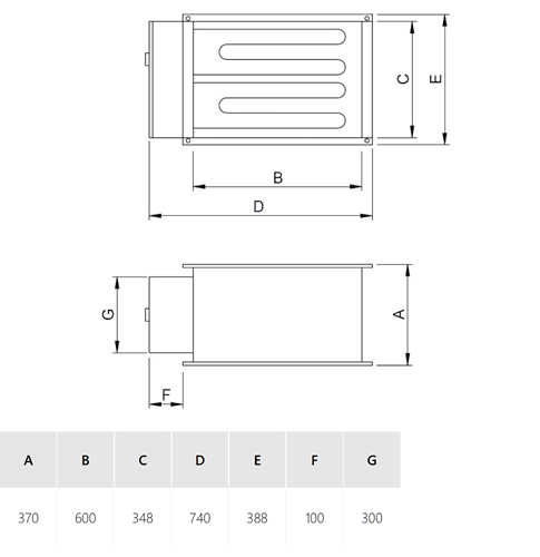 Batteria di riscaldamento elettrico da montare alla mandata dei ventilatori in linea DIRECT-AIR. Equipaggiata con resistenze elettriche corazzate (230V - 3W/cm2), di un termostato di sicurezza a riarmo automatico (90ºC) montato in serie con un altro termostato di sicurezza (120ºC) a riarmo manuale (RESET). La scatola per i collegamenti è sempre installata su un fianco. Le resistenze sono precablate per essere collegate a una rete 3/400V, il circuito di protezione è alimentato in monofase 1/230V. La velocità minima dell'aria nella batteria deve essere superiore a 2 m/s e la temperatura massima dell'aria di 60°C.