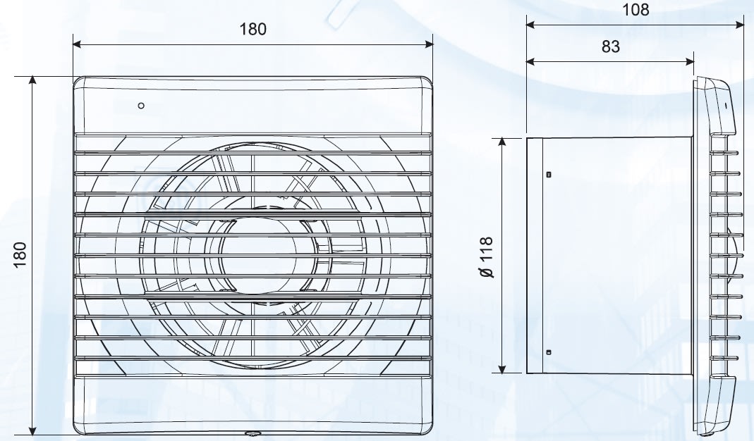 Ventilatori elicoidali extrapiatti,con serranda anti-ritorno incorporata; portata di circa 200 m3/h, spia luminosa di funzionamento e motore 230V 50Hz, Classe II, IP44, con protezione termica per temperatura di esercizio fino a 40°C. Con Spia luminosa e Serranda antiritorno