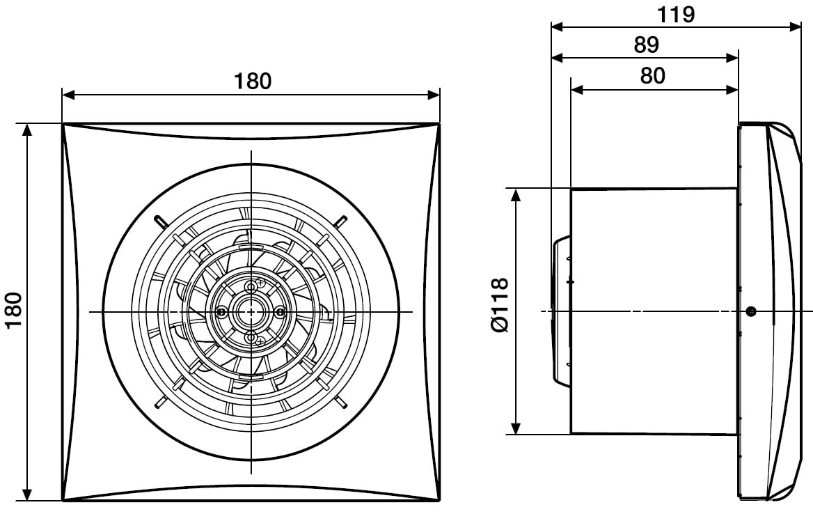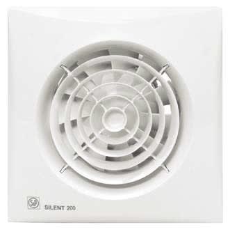 Ventilatori elicoidali con basso livello sonoro con portata di circa 180 m3/h. Con serranda anti-ritorno incorporata, spia luminosa di funzionamento, motore 230V-50Hz con cuscinetti lubrificati a vita e montati nel silent- blocks, IP45, Classe II, con protezione termica per temperatura di esercizio fino a 40°C