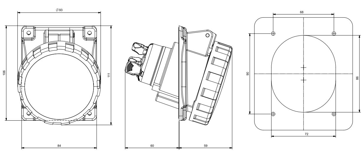 32A 2P+T 6h 200-250V 60Hz - 50Hz 84X106MM Morsetti a molla