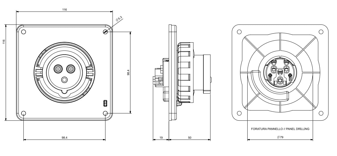 20A 2P 3W 6h 250V 120X120MM Morsetti a vite