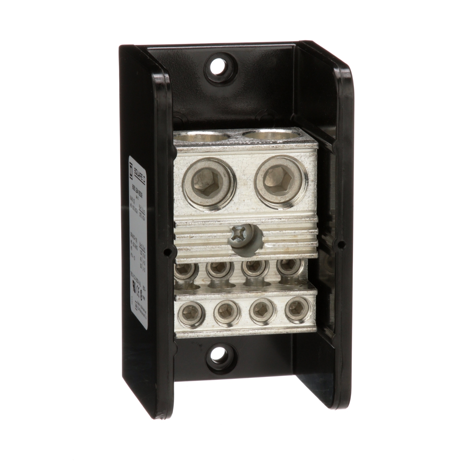 I blocchi di distribuzione dell'alimentazione Linergy sono progettati per cavi di terminazione e sono conformi agli standard NEMA. Questo blocco unipolare ha due aperture capocorda sul lato linea (principale) e otto aperture capocorda sul lato carico (derivazione). Il capocorda lato linea è in grado di accettare uno #da 6 a 500 kcmil, cavo in rame o alluminio. I capocorda laterali del carico sono dimensionati in modo da accettare uno #da 14 a 2/0 fili di rame o alluminio. I capicorda sono in alluminio. Icapicorda hanno un valore nominale di 760 ampere con cavo in rame e di 620 ampere con cavo in alluminio. I connettori hanno un valore nominale di 600 V. L'alloggiamento è di tipo fenolico generico. Questi blocchi di distribuzione dell'alimentazione Linergy sono omologati UL per componenti e certificati CSA.